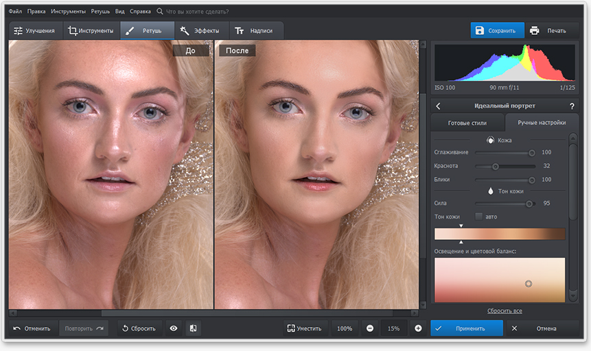 - есть функция распознавания лица, автоматической ретуши, «умной» замены фона.