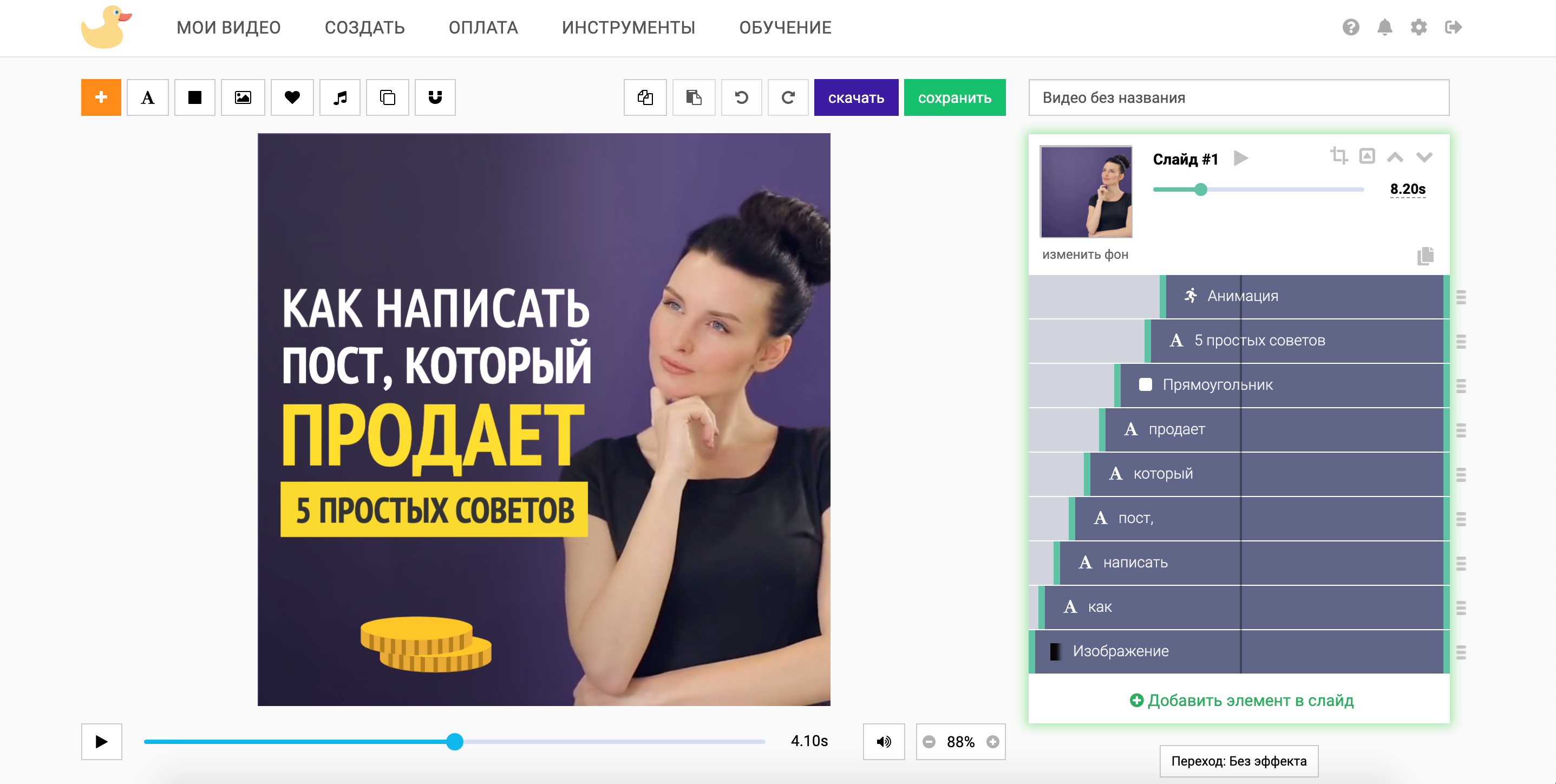 Стоимость: создание и редактирование проекта — бесплатно. Но чтобы его потом скачать, нужно будет заплатить от 150 рублей и выше