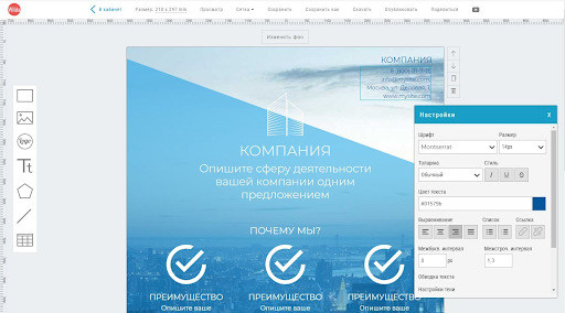 Онлайн-конструктор, с помощью которого можно создавать печатную продукцию: листовки, открытки, визитки, буклеты. Также в нём можно редактировать фото для соцсетей, а именно — создавать обложки, превью, аватарки. А ещё с помощью Wilda можно делать презентации и таблицы — по отзывам пользователей, сервис может заменить функционал Microsoft Word, Excel и PowerPoint.