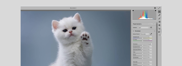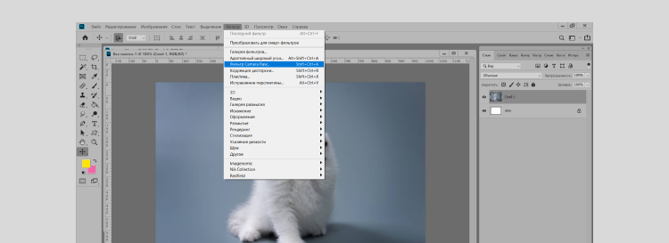 Есть и другой вариант — «Фильтр» — «Camera Raw». Camera Raw — отличный помощник в ретуши в Photoshop, который позволяет быстро улучшать кадры. В фильтре довольно много различных настроек, нам нужны 3 их них — чёткость, насыщенность и красочность. Camera Raw запускается через фильтр.